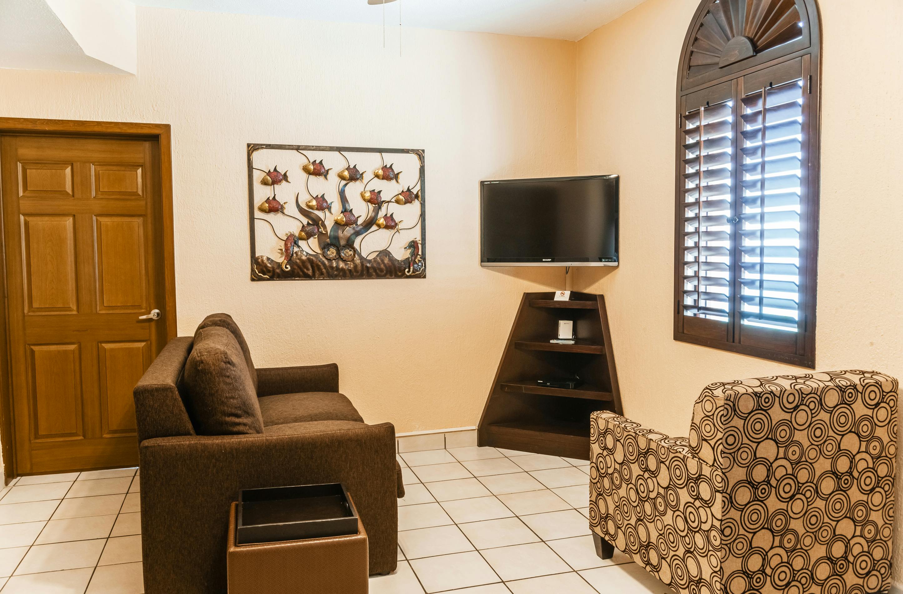 Habitación con dos cama matrimoniales, aire a condicionado, cocineta, wifi, pantalla plana, tv con cable, sofá cama, vista al mar.