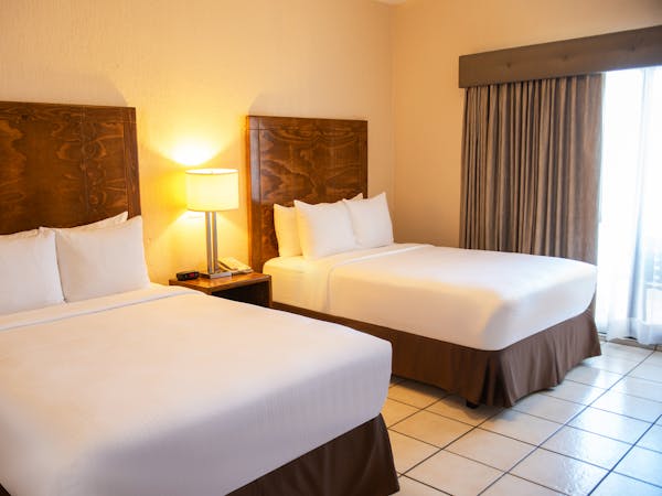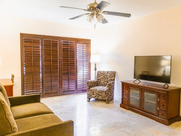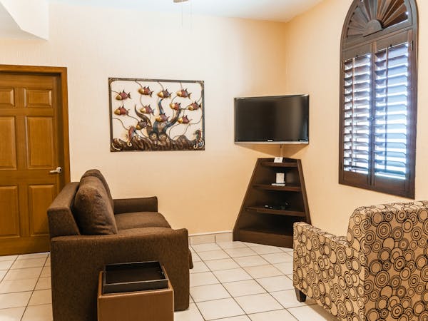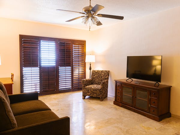 Habitación con dos cama matrimoniales, aire a condicionado, cocineta, wifi, pantalla plana, tv con cable, sofá cama, vista al mar.